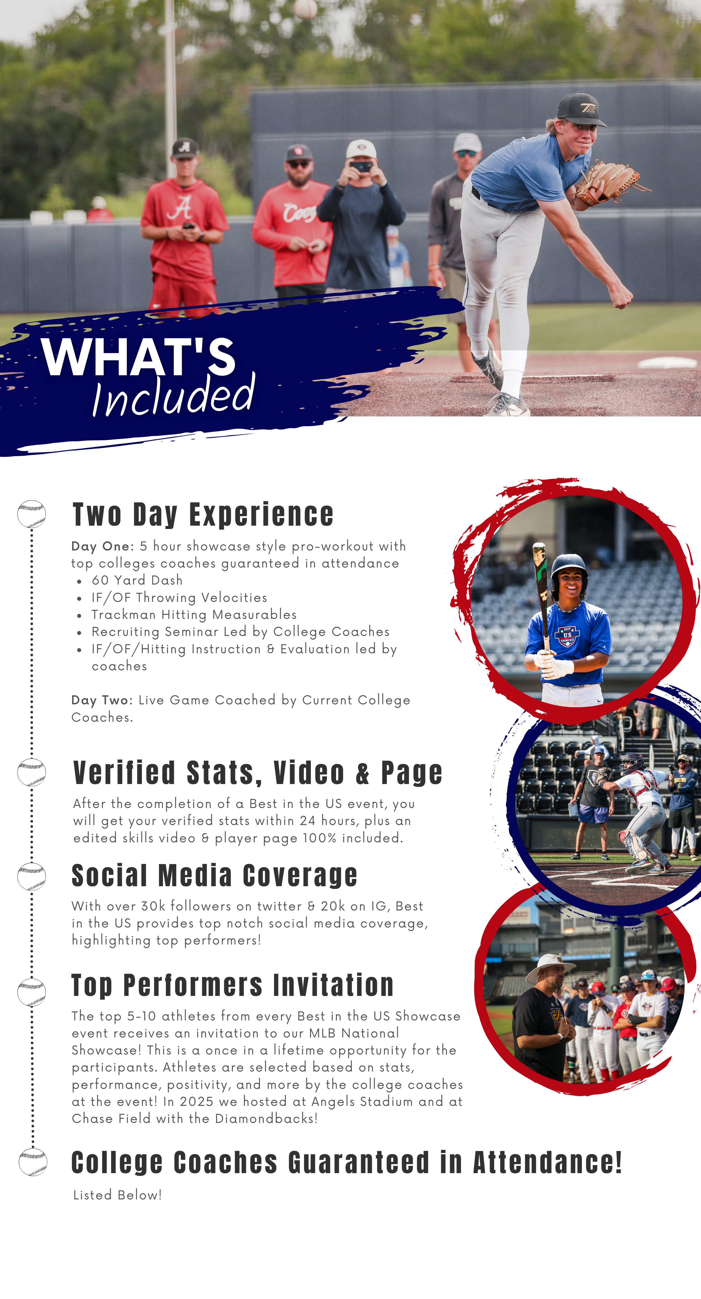 Day 1 typically includes physical assessments, offensive and defensive showcases and verified measurable workouts (including 60-yard dash, exit velocity, pop time), recruiting roadmap seminar, live batting practice and bullpens.